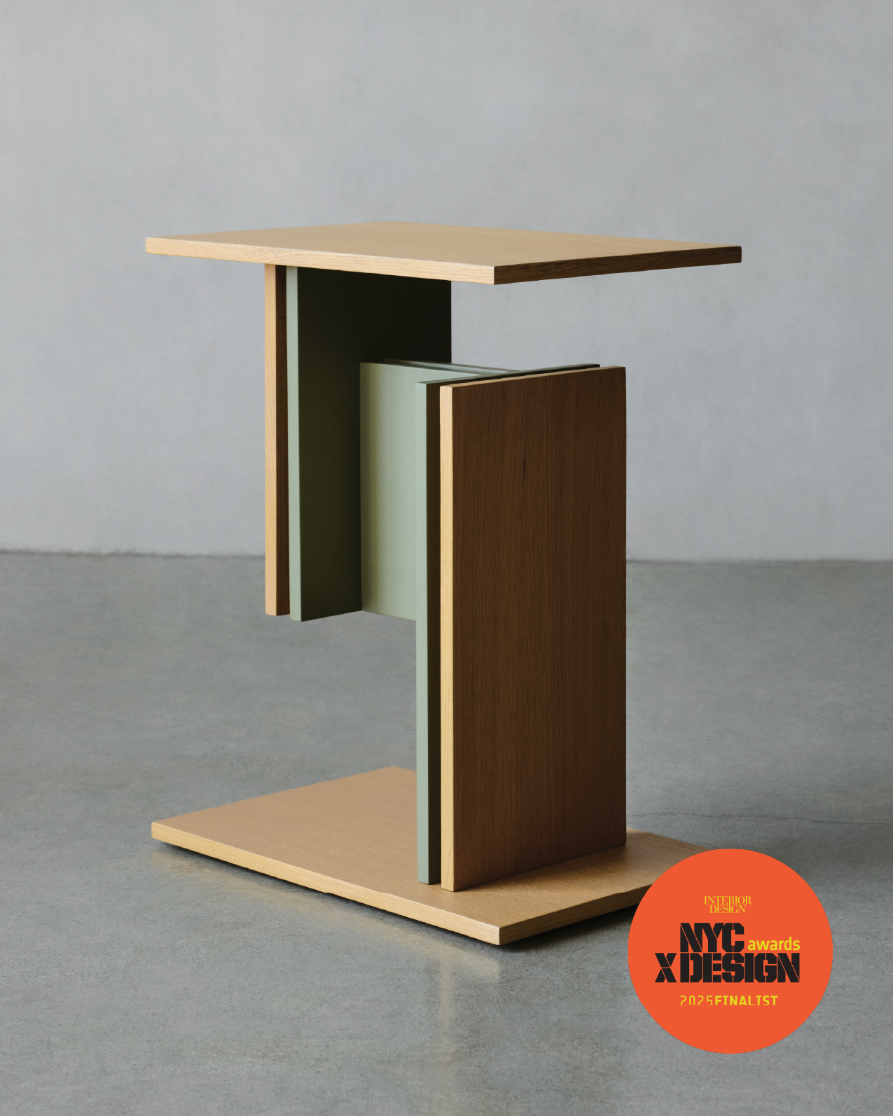 The side table features a cantilevered, asymmetrical design that appears to float off the ground, combining the warmth of white oak as its primary material with a pop of color for added character. It highlights the complexity of how two finishes seamlessly connect while playing with the object's negative and positive space.